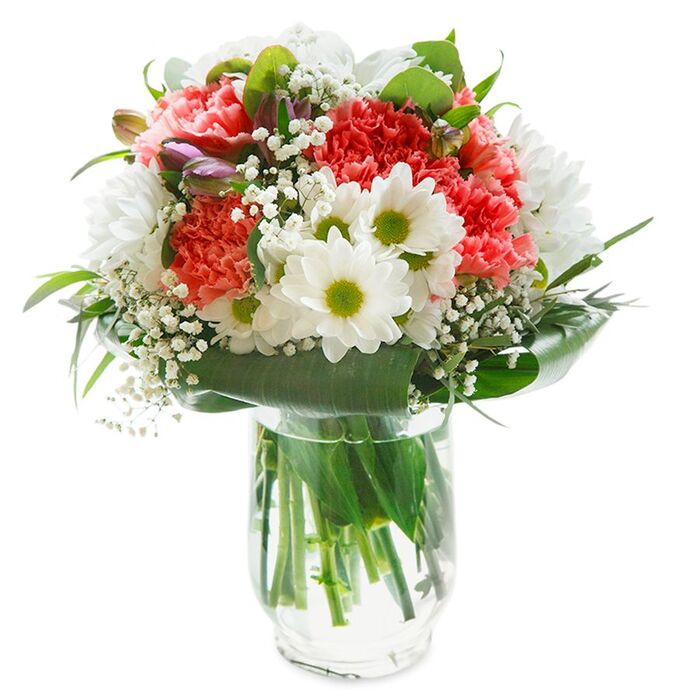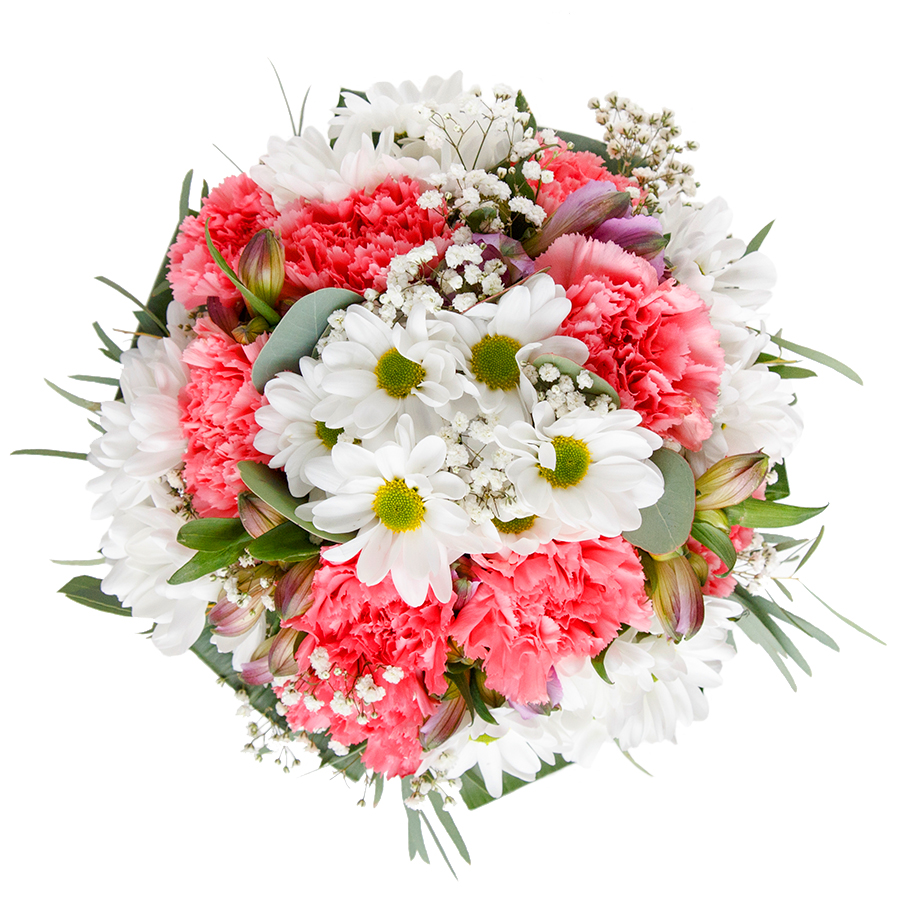 Enchant your loved ones with our beautiful and unique flower arrangement. This sophisticated bouquet features a soft color palette including white chrysanthemums, airy gypsophila, soft light pink carnations, and rich aspidistra leaves.